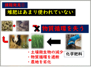 お二人の発表では、現在の農業現場が抱える課題として、牛や馬の糞は約6か月間熟成させて安全性の高い堆肥として利用できる一方、即効性があり扱いやすい化学肥料が主流となっている現状が紹介されました。